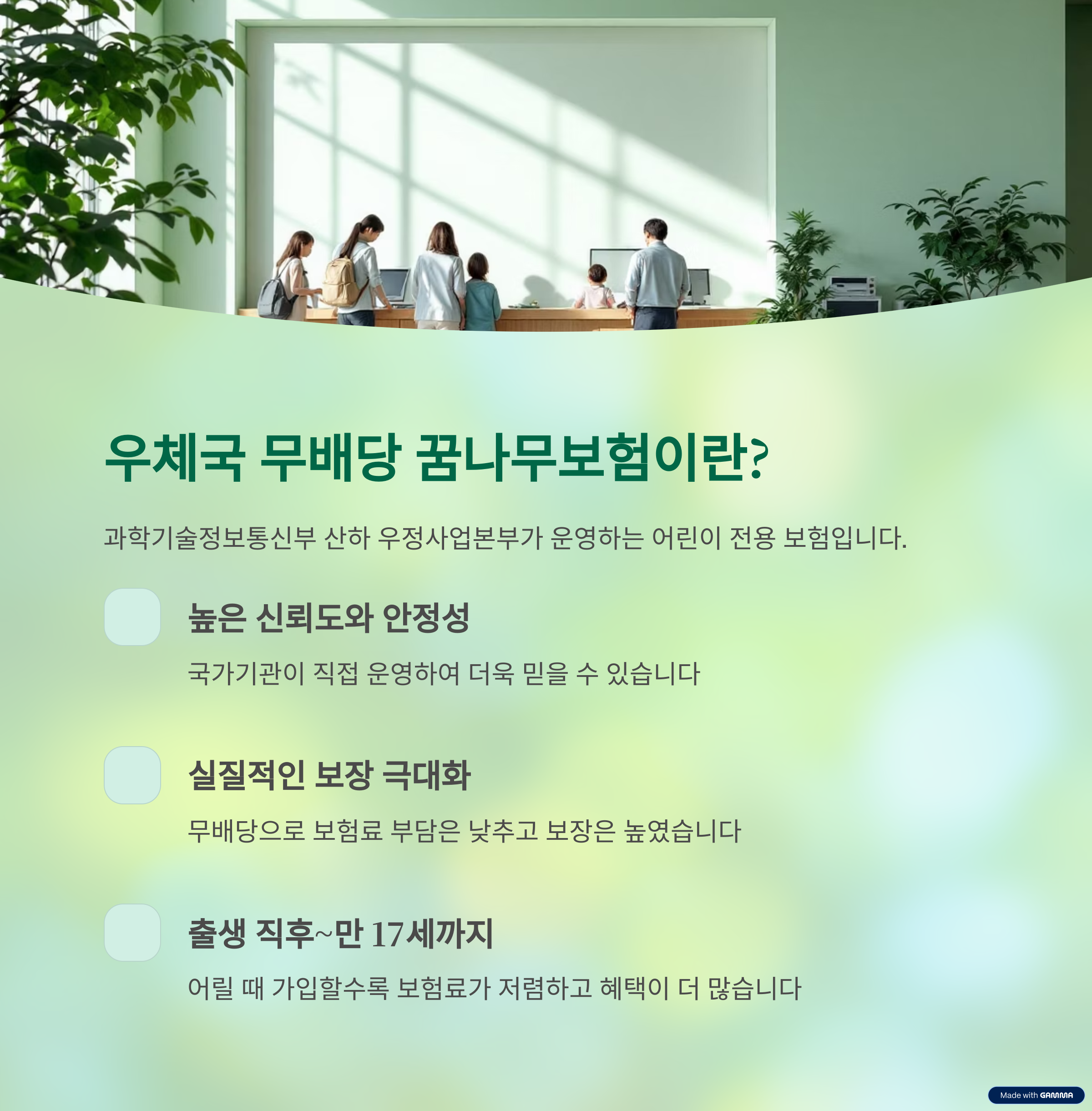 우체국 무배당 꿈나무보험은 과학기술정보통신부 산하의 우정사업본부가 운영하는 어린이 전용 보장보험입니다.