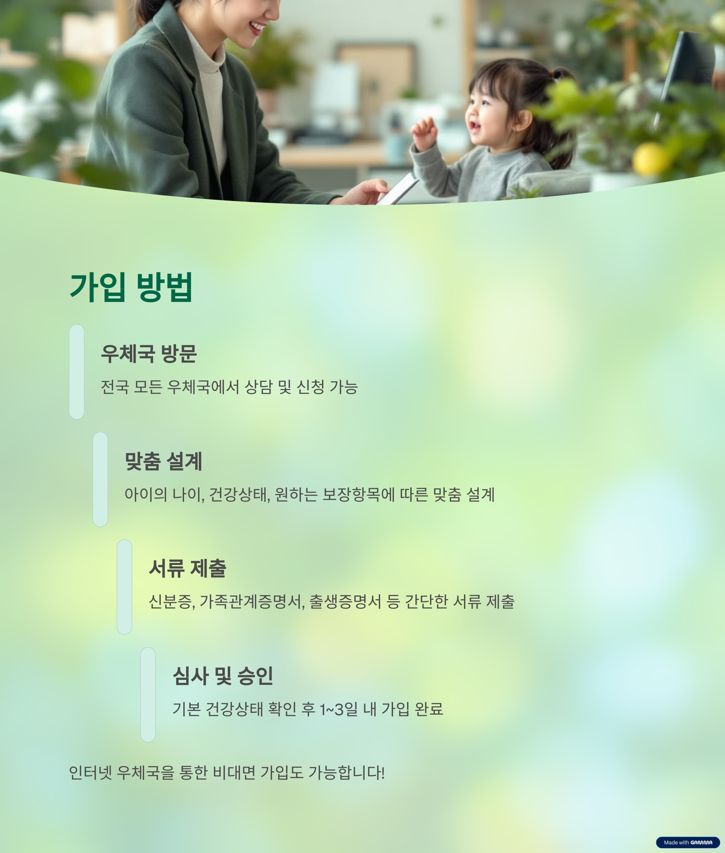 - 가입 신청서 작성신분증, 가족관계증명서, 출생증명서 등 간단한 서류로 접수됩니다.